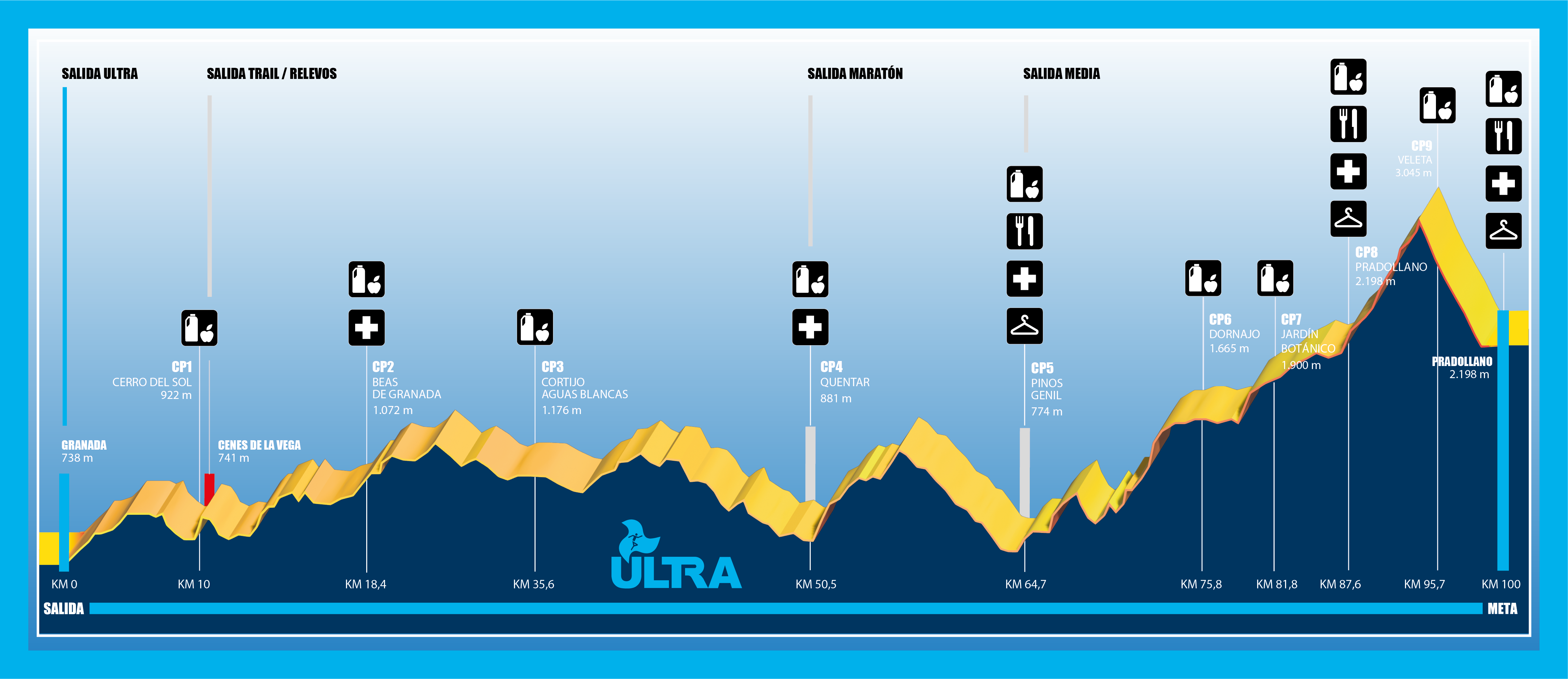 Every participant of the ULTRA and TRAIL may deliver two bags, delivered by the organization when removing the bib number, with whatever material they consider they may need. One bag will be at the refreshment station established in the town of Pinos Genil and the other bag will go to the Pradollano refreshment station, before the climb, and then to META.
